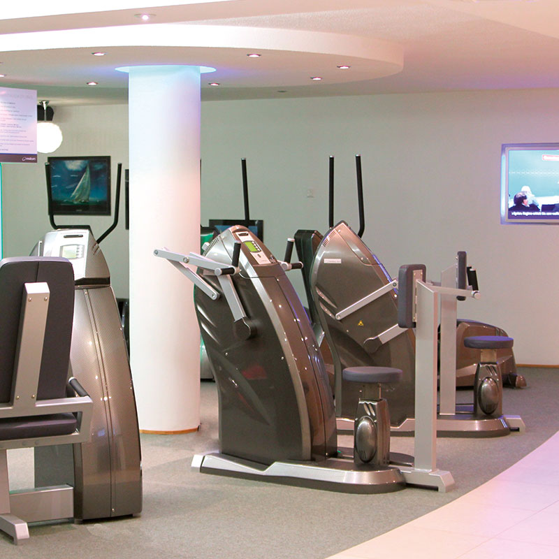 Trainiere an einem Gerätepark von hochwertigen Gym80- und Technogym-Maschinen. Annähernd jedes Gerät ist mit einer Excenterscheibe ausgestattet, die es dem Trainierenden erlaubt, ein optimales, progressives Widerstandstraining auszuführen. Es sind pro Hauptmuskelgruppe mindestens zwei oder mehr Geräte vorhanden, so daß selbst zu Stoßzeiten nur wenig Wartezeit in Kauf genommen werden muß.